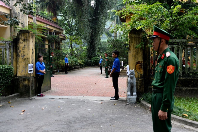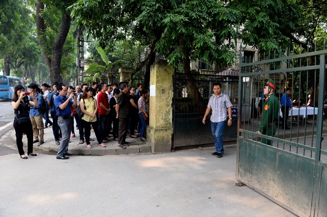 | Cổng vào căn biệt thự cổ của gia đình tướng Giáp trên phố Hoàng Diệu đông đúc ngay từ sáng 6/10. |