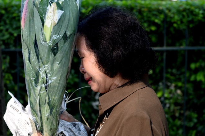 | Người phụ nữ vừa từ quê hương của Đại tướng trong Quảng Bình ra đến nơi. Bà đã khóc khi mới xuống xe. |