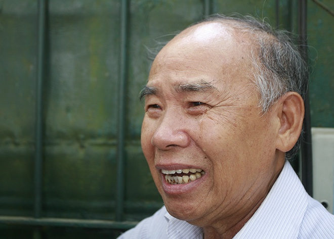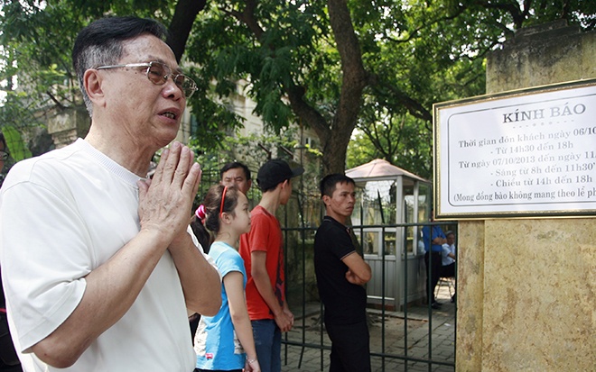 | Ông Phó Đức Phụ (bị khiếm thính) chắp tay trước cổng nhà Đại tướng. |