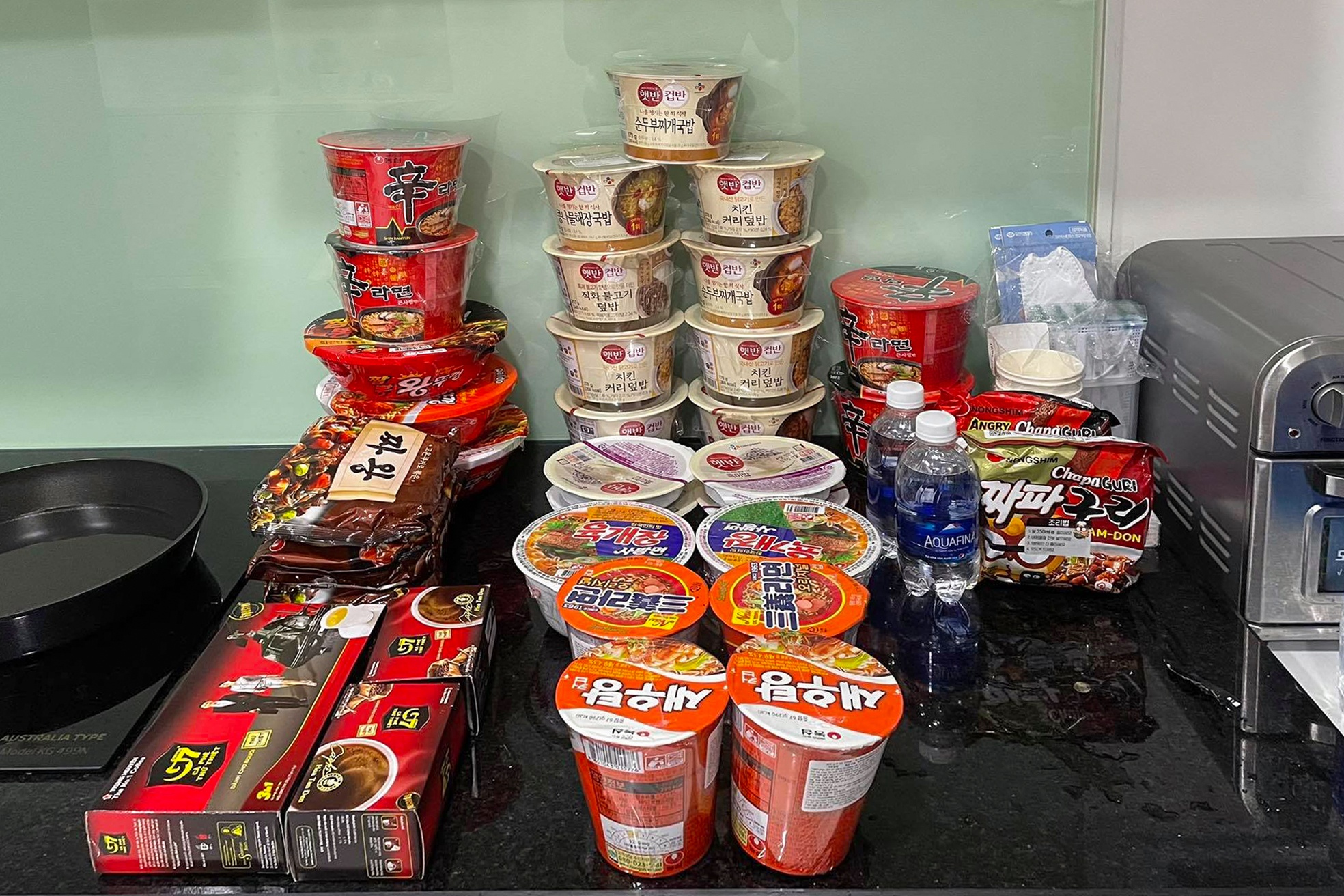 Tôi ngay lập tức đến cửa hàng tiện lợi mua đồ ăn, cà phê, nước uống. Đồ ăn tôi tích trữ chủ yếu là mì ăn liền Hàn Quốc.
