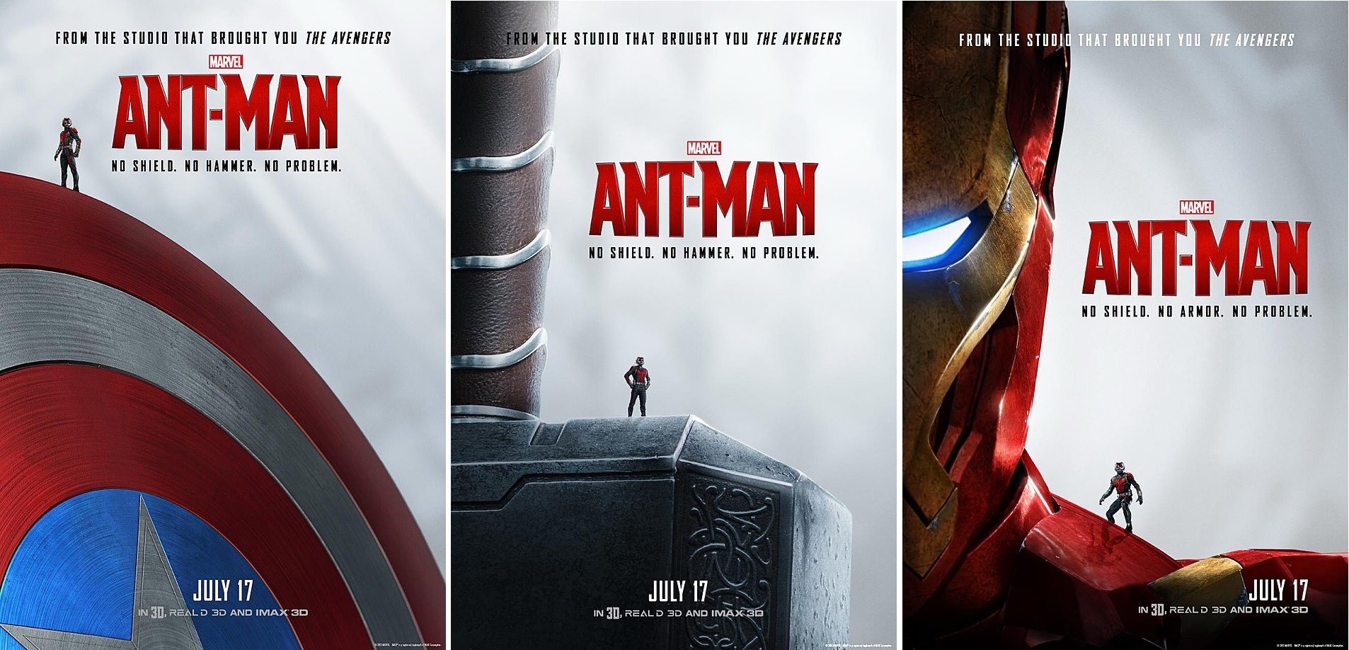Ở loạt poster mới nhất, Ant-Man xuất hiện bên cạnh những hình ảnh biểu tượng của thế giới phim anh hùng Marvel. Đó là chiếc khiên của Captain America, búa Mjölnir của Thor và bộ giáp sắt của Iron Man. Người hâm mộ được thấy kích thước bé nhỏ của Người Kiến khi đứng cạnh chúng, kèm theo câu quảng cáo “No Shield. No Armor. No Problem” (tạm dịch: Không có khiên. Không có giáp. Không sao hết).