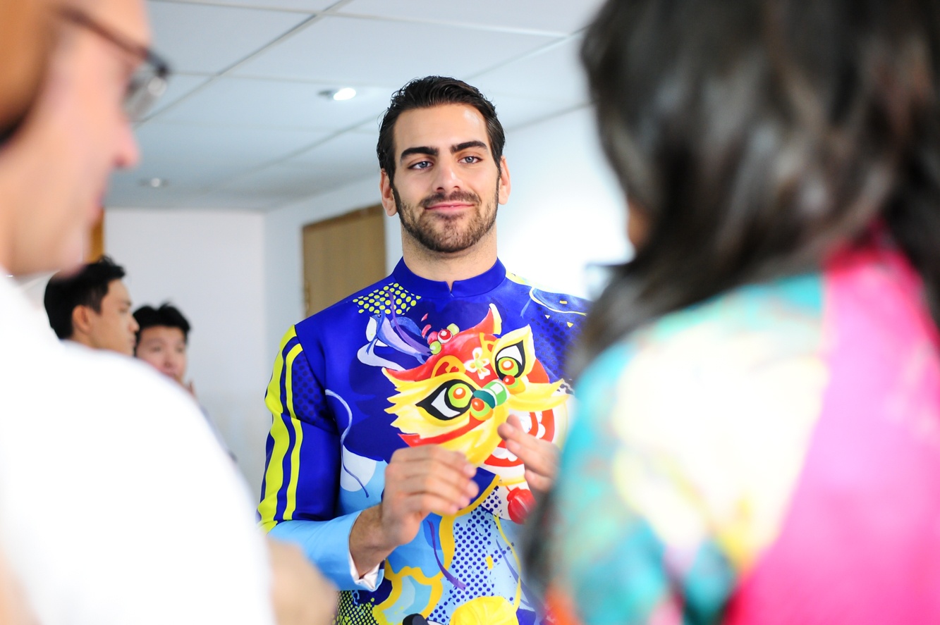 | Tại buổi chụp ảnh, Nyle DiMarco được yêu cầu diện áo dài truyền thống Việt. Chàng trai 25 tuổi tỏ ra rất hào hứng với buổi chụp ảnh và thiết kế áo dài nhiều màu sắc. Anh chia sẻ: "Tôi chỉ biết đến áo dài thông qua hình ảnh trên báo. Bộ cánh rất vừa vặn vóc dáng của tôi, màu sắc sinh động cũng là gam mà tôi yêu thích. Tôi đã rất trông đợi buổi ghi hình". |
