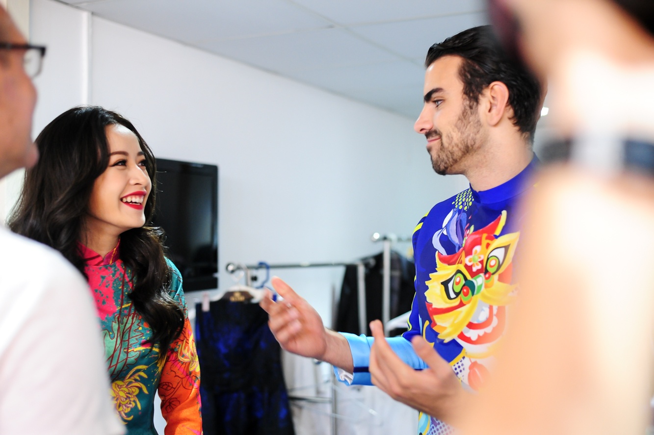 | Tham gia chụp ảnh cùng Nyle DiMarco có diễn viên Chi Pu. Người đẹp 22 tuổi diện áo dài nhiều hoạ tiết nhiều màu bắt mắt, khá đồng điệu với trang phục bạn diễn. |