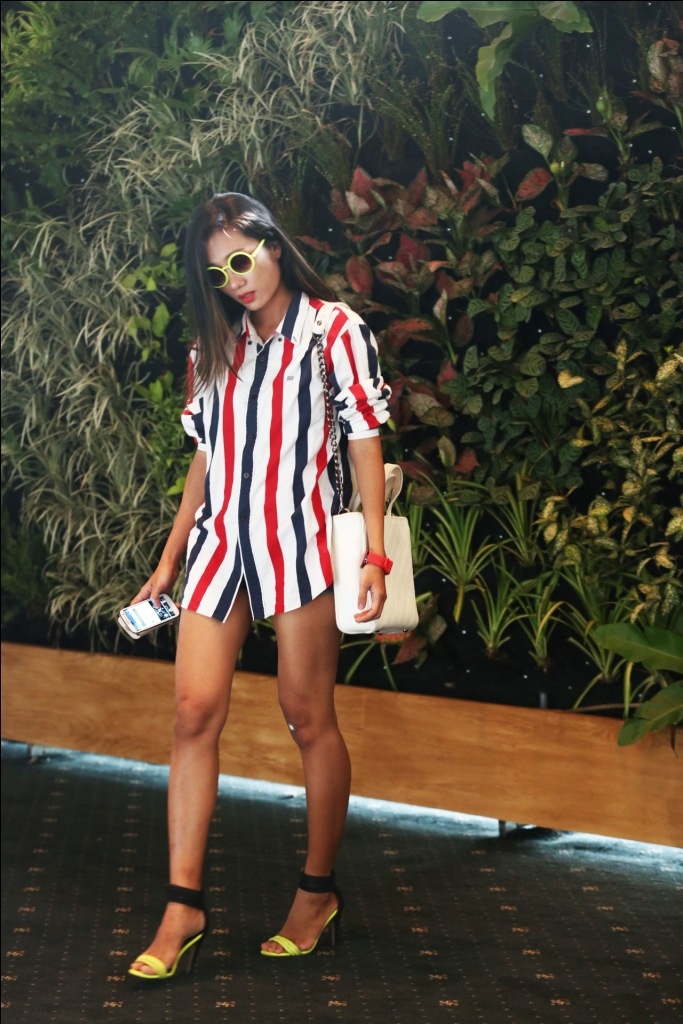 | Người mẫu Nhã Trúc năng động với áo sơ-mi sọc kẻ, kết hợp hài hòa cùng quần shorts, phụ kiện nhiều màu sắc trẻ trung, bắt mắt. |