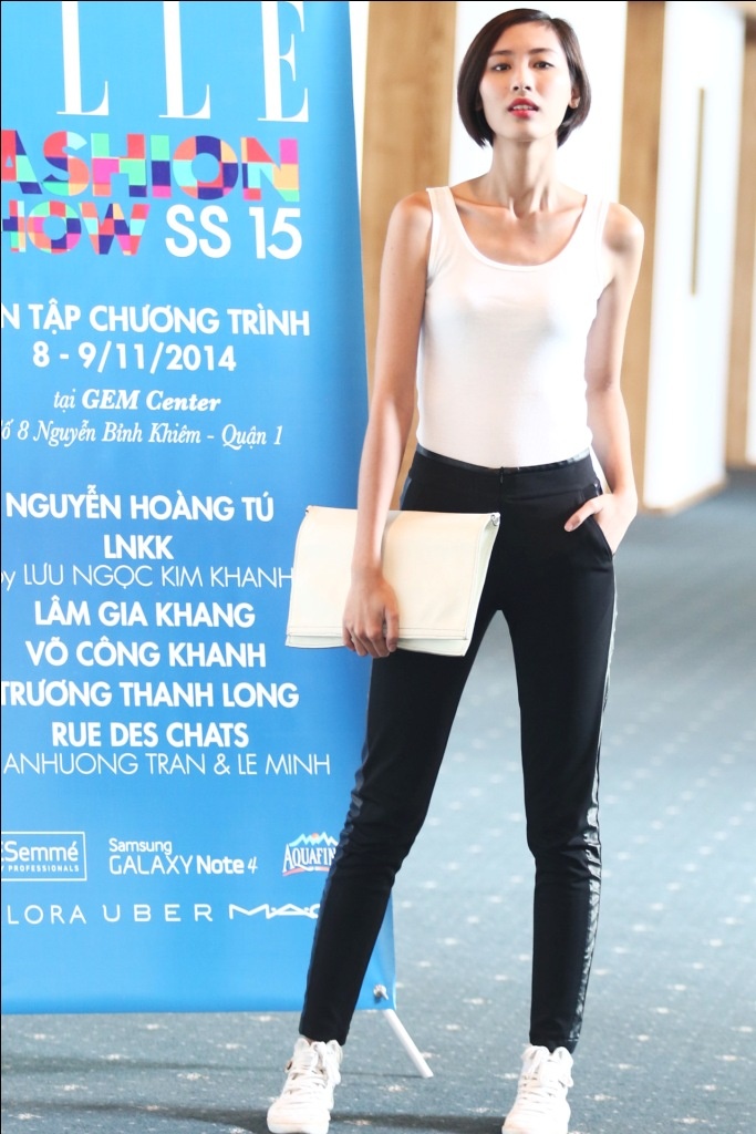 Trương Thanh Long, Võ Công Khanh, Lâm Gia Khang, Kim Khanh, AnHuong Trần và Lê Minh sẽ giới thiệu bộ sưu tập thời trang phong cách ứng dụng dành cho mùa xuân hè tại chương trình Elle Fashion Show diễn ra vào ngày 13/11, tại TP.HCM. Để show thời trang lớn nhất nhì trong năm diễn ra thành công tốt đẹp, dàn người mẫu của Elle Show dành 2 buổi tập luyện và ráp chương trình. Trong ảnh, Hoàng Thùy diện trang phục của nhà thiết kế, nỗ lực tập luyện.