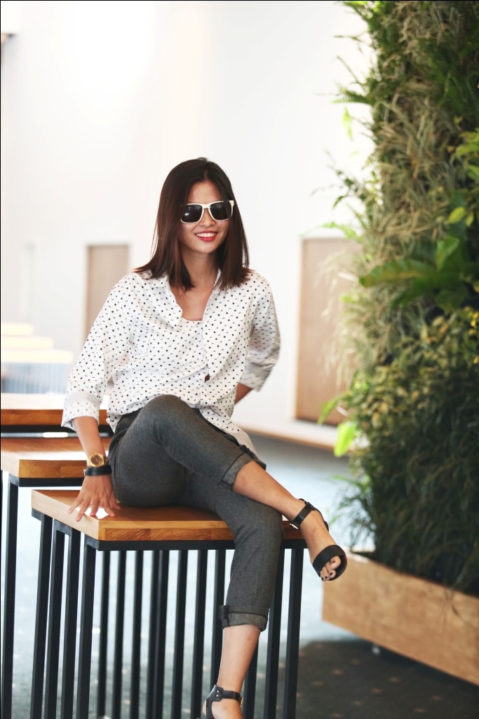 | Sáng ngày 9/11, cùng với Hoàng Thuỳ, các chân dài đình đám góp mặt ở show diễn có buổi tập thứ 2 cùng ê-kíp của chương trình và các nhà thiết kế tham gia show diễn. Trong ảnh, người mẫu Thiên Trang ăn vận sành điệu với quần xắn lai, áo sơ-mi họa tiết chấm bi, kính râm sành điệu ngồi chờ đợi đến lượt tập của mình. |