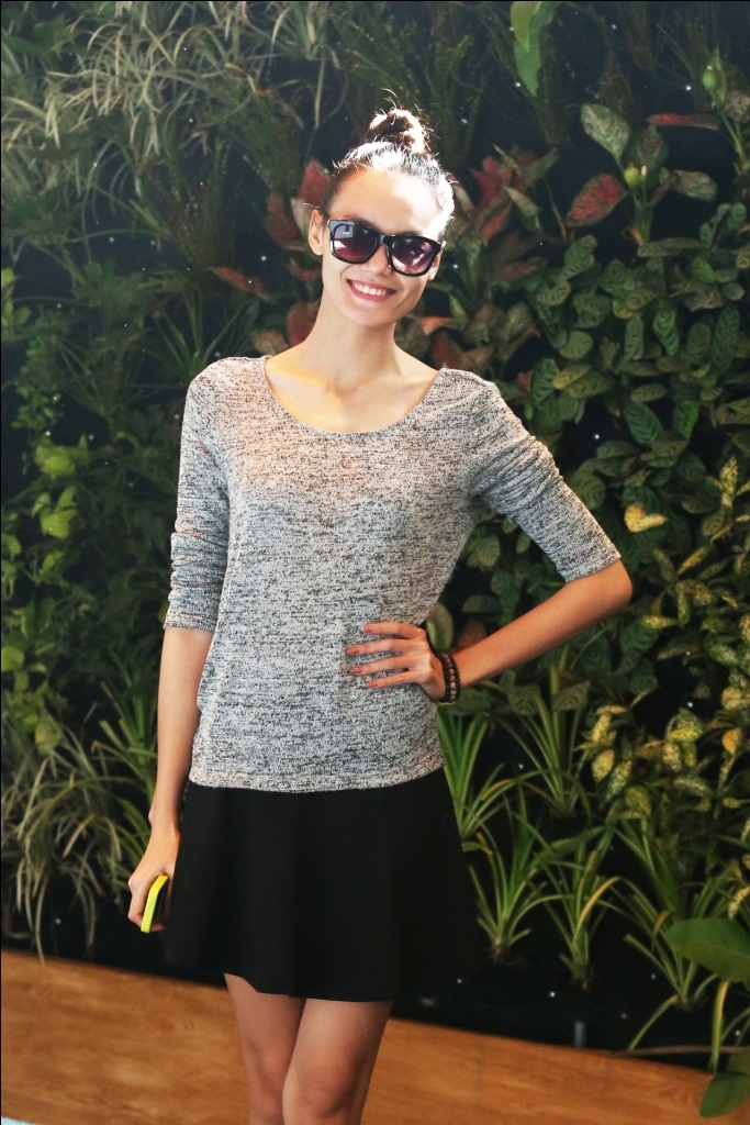 | Chân dài Thanh Thảo chuộng phong cách phóng khoáng với áo thun dáng rộng và chân váy xòe ngắn. |
