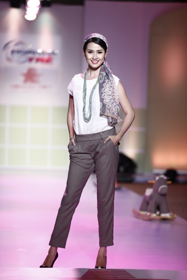 | Top 5 Hoa hậu Việt Nam 2012 Phan Thị Mơ trình diễn một thiết kế công sở năng động dành cho bà bầu. |