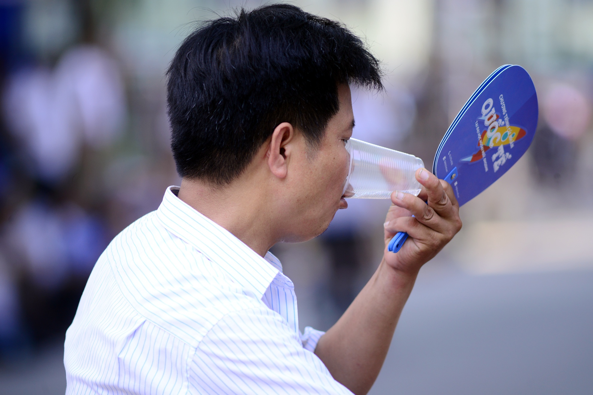 | Một người đàn ông uống nước liên tục, quạt tay liên hồi. |