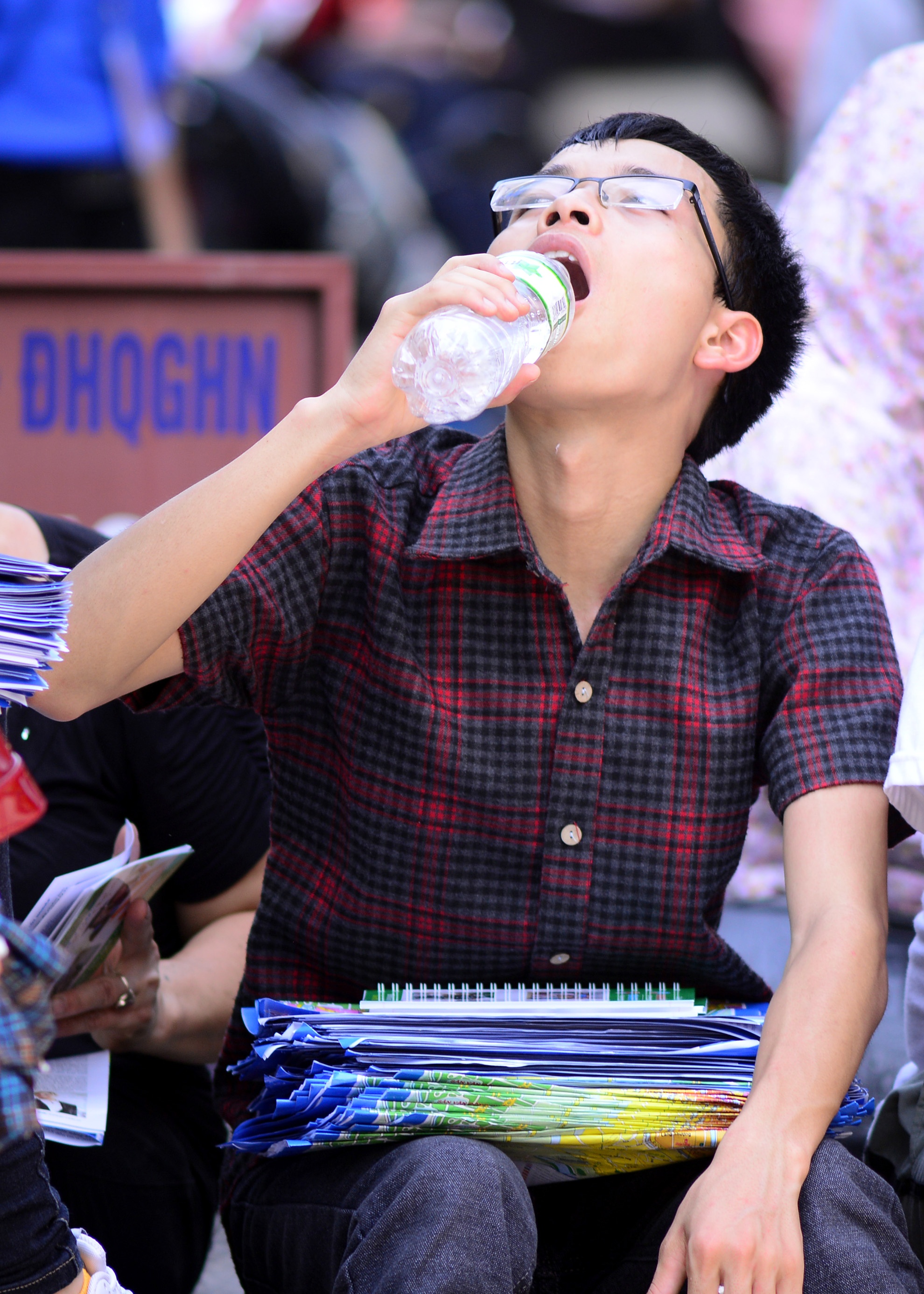 Trong lúc đợi thí sinh làm bài thi đánh giá năng lực vào ĐH Quốc gia Hà Nội, nhiều phụ huynh phải uống nước liên tục, núp dưới các gốc cây tránh nắng nóng.