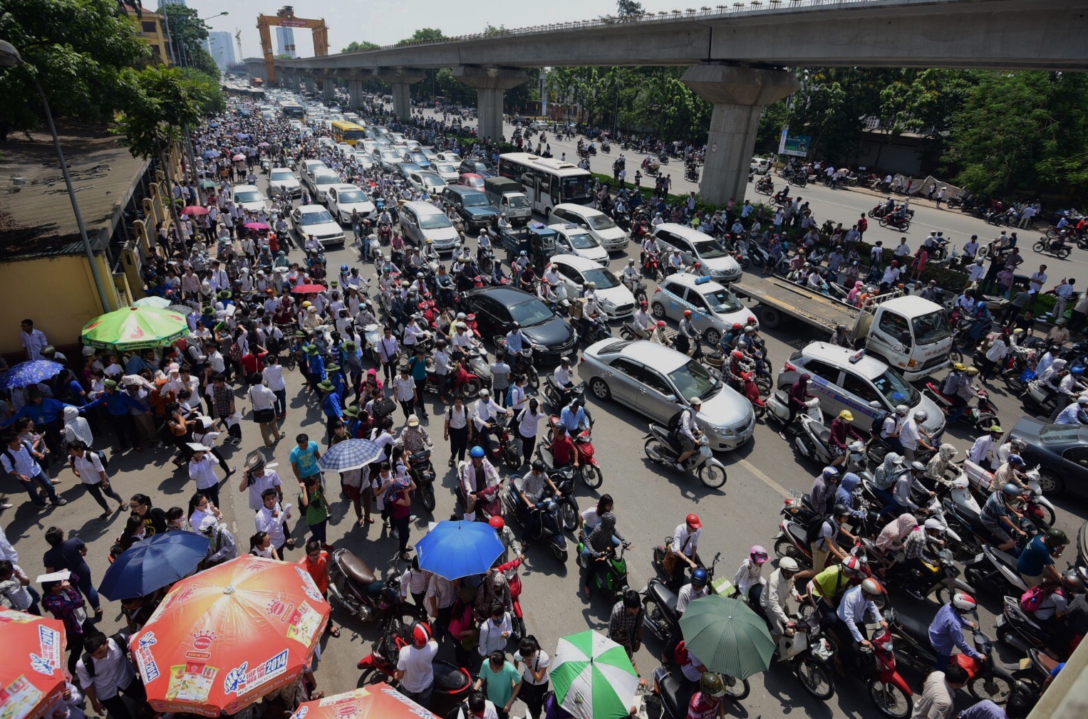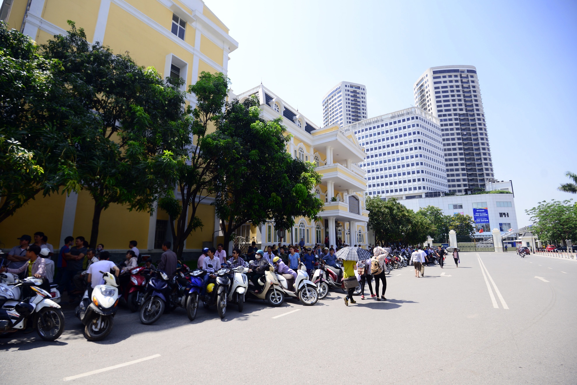 Tại cụm thi ĐH Khoa học Xã hội và Nhân văn, sáng 30/5, dù là thứ bảy nhưng đường Nguyễn Trãi vẫn ùn tắc nghiêm trọng do phụ huynh tràn ra lòng đường đứng chờ thí sinh. Khu vực này khá nắng vì cây xanh đã bị chặt bớt để phục vụ dự án đường sắt trên cao.