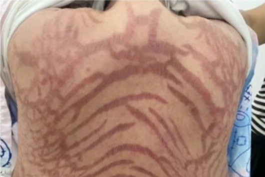 Da người bệnh xuất hiện dày đặc các mảng rạn đỏ tím giống vảy rắn. Ảnh: Jimu News. |