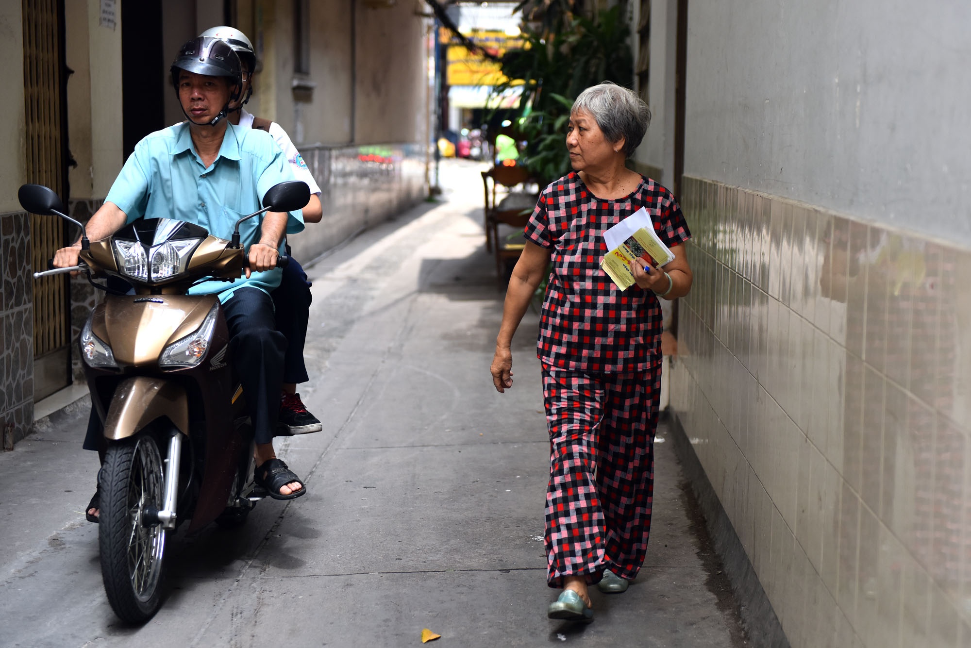 Tóc đã bạc, chân tay hay nhức mỏi lại không biết lái xe máy nên mỗi lần đi họp trên phường hay đến từng hộ dân giao giấy tờ bà đều đi bộ. |