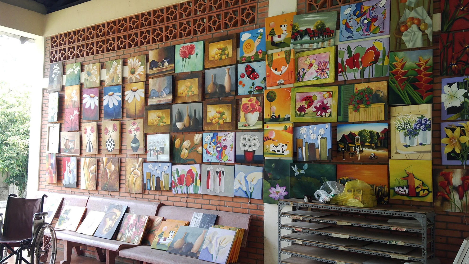 Những bức tranh chị vẽ được trưng bày tại trung tâm. Khách đến thăm trung tâm thấy đẹp nhiều người hỏi mua nhưng chị không bán mà chỉ tặng.