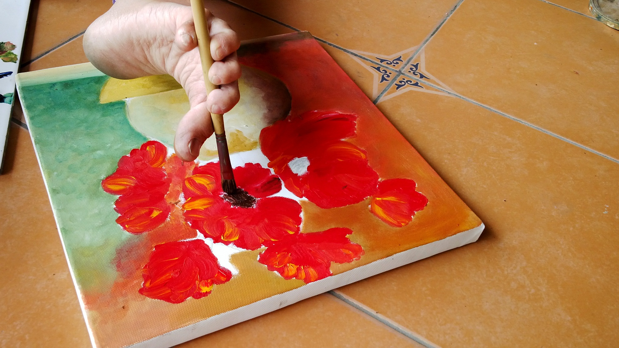 Trong suốt thời gian qua, chị được một mạnh thường quân tạo điều kiện đi học vẽ. Qua đó, chị nắm được thao tác vẽ cơ bản, biết cách pha màu, đưa cọ bằng chân nhuần nhuyễn.