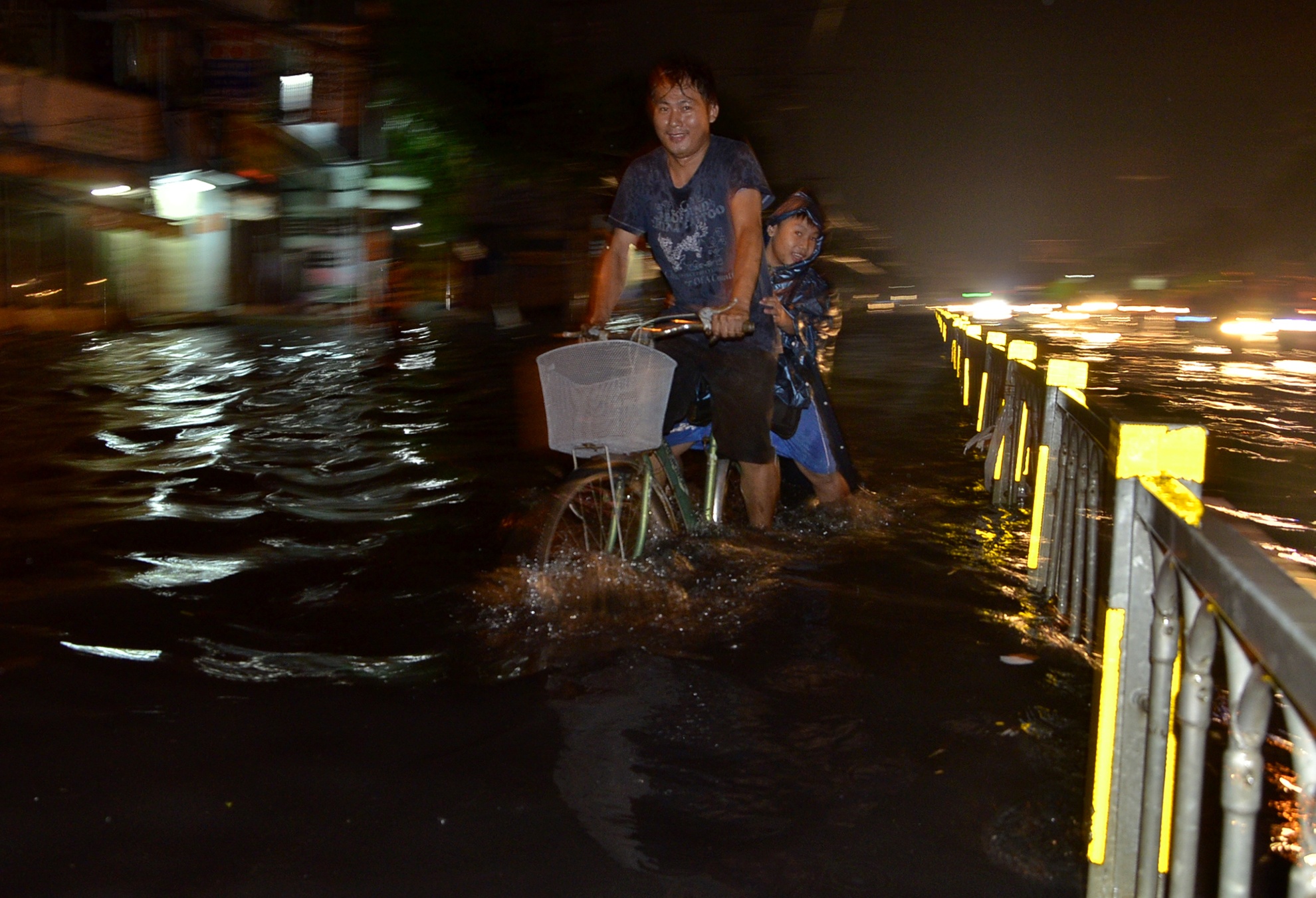 | Anh Văn Quốc Huỳnh (ngụ đường Tên Lửa, quận Bình Tân) bì bõm đạp xe giữa biển nước chở con về nhà trong đêm tối. "Khi tôi chờ con đi học thêm thì trời mưa như trút, tan lớp hai bố con phải chờ ngớt mới về. Trời tối thui nhưng vẫn phải vượt qua đoạn đường ngập sâu để kịp về dùng bữa cơm tối", anh Huỳnh nói. |