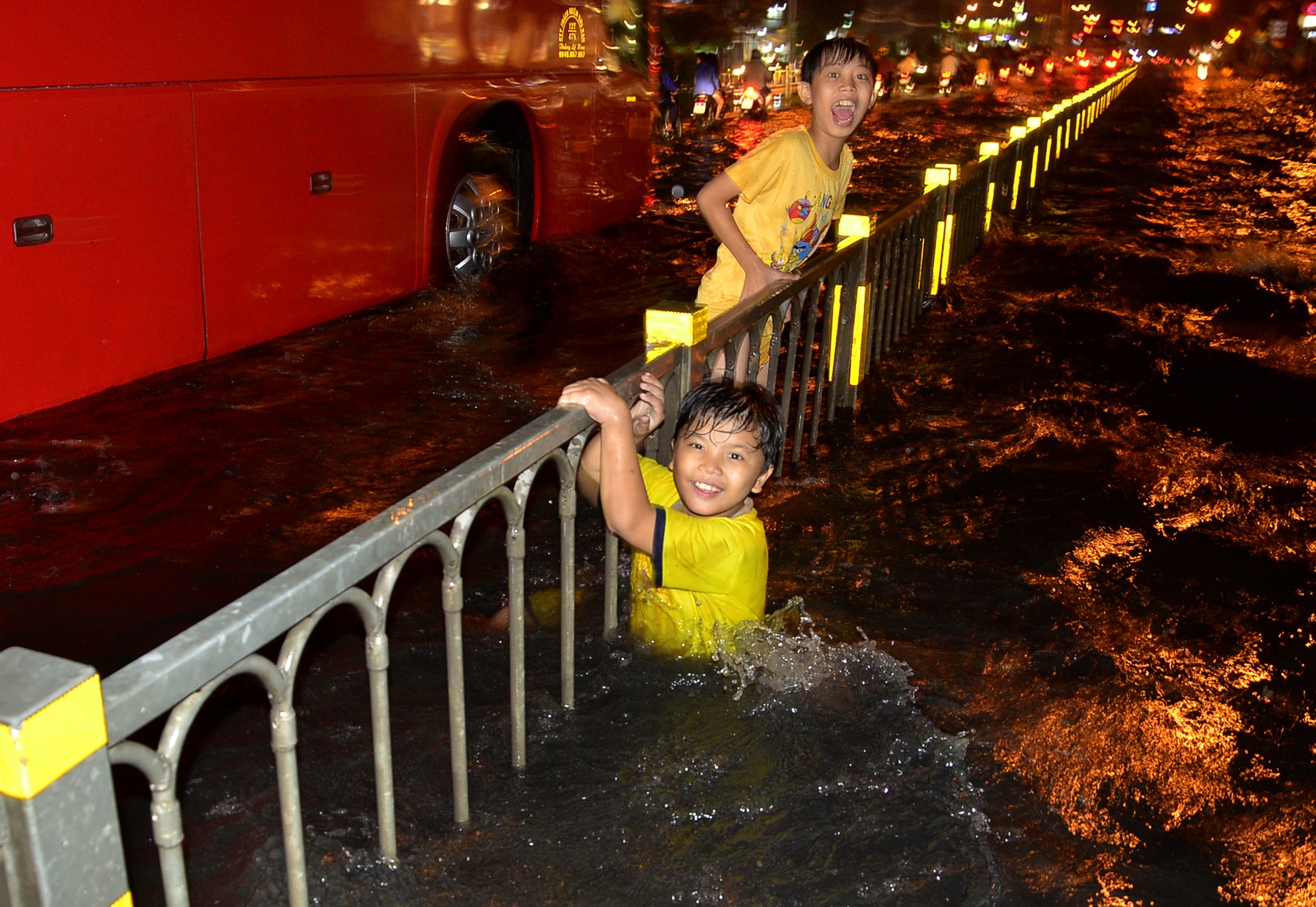 | Một số trẻ em tại khu vực ngập nước trên đường Kinh Dương Vương đùa giỡn, bơi giữa đường. |