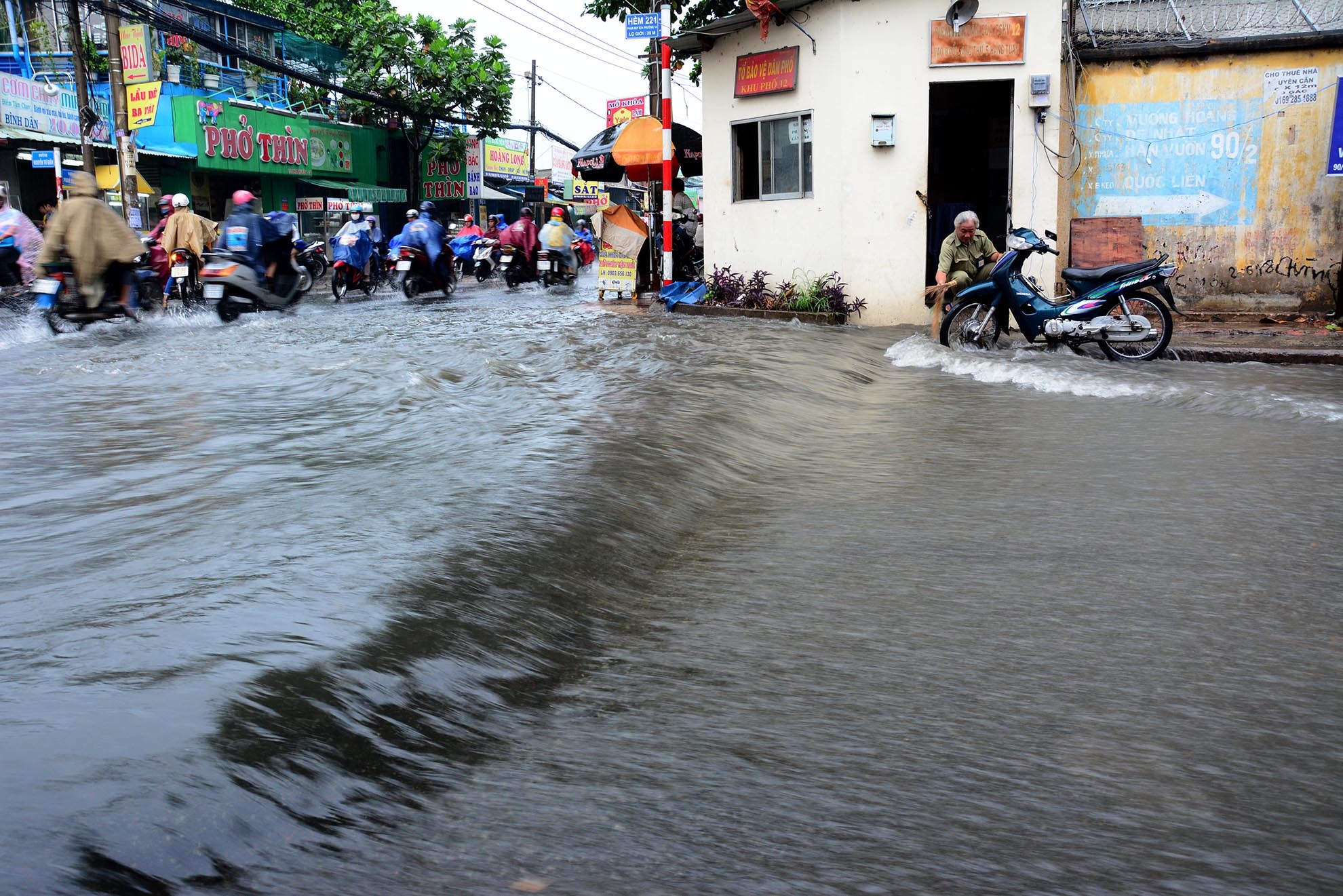 Chị Phan Bích Hạnh (ngụ đường Nguyễn Văn Quá, phường Đông Hưng Thuận, quận 12) cho biết, cơn mưa bắt đầu đổ xuống như trút nước từ 16h, sau gần 20 phút một đoạn đường dài khoảng 500 m mênh mông nước. "Chỗ ngập sâu nhất hết bánh xe máy, rất nhiều người bị té ngã dụi xuống biển nước, người ướt nhèm, xe bị chết máy hàng loạt", chị kể.