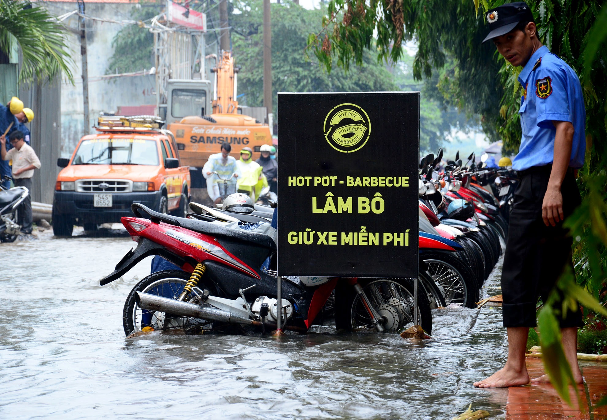Nhiều hoạt động kinh doanh tại những tuyến đường ngập nước bị ngưng trệ hoàn toàn. Nước rút rất chậm, đến 21h tối khu vực này vẫn như một con sông.