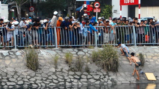 Nhiều người dân chuyền dây thừng, phao xuống cho thanh niên này và bảo: “Lên bờ đi, cứ bơi hoài chịu không nổi đâu”, nhưng thanh niên chỉ giữ lấy phao mà không chịu lên bờ. Lát sau, thanh niên này tiếp tục bơi từ dưới chân cầu Nguyễn Tri Phương đến Xóm Củi. Lực lượng công an, dân phòng chạy theo để đón bắt.