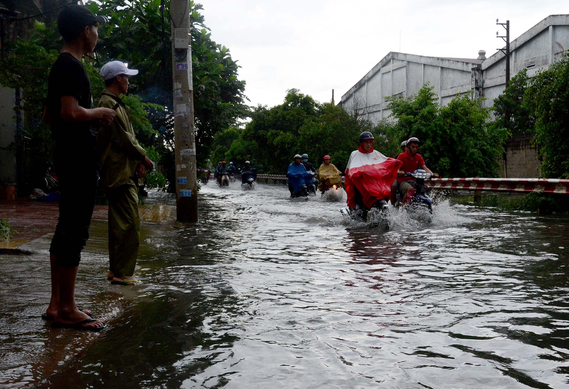 | Phần làn đường dành cho xe máy bị ngập nặng nên nhiều người không dám chạy xe vào. Nhiều người sinh sống và làm việc tại khu vực này phải bì bõm lội giữa "biển nước". |