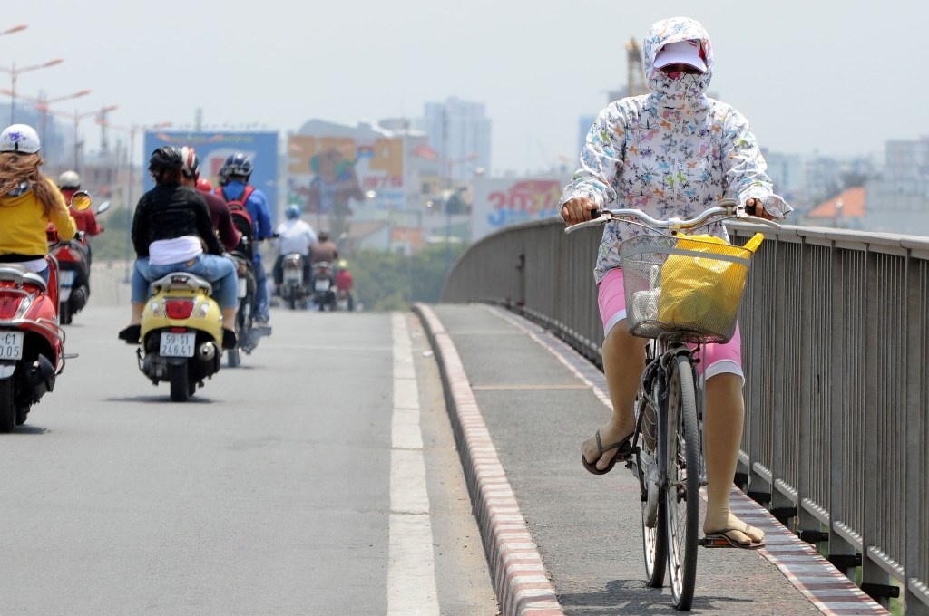 | Khi ra đường, nữ giới thường sử dụng tất cả trang phục chống nắng như áo khoác, váy, khẩu trang, bao tay. Theo dự báo của Trung tâm Khí tượng Thủy văn Quốc gia, hai ngày tới, nhiệt độ ở TP HCM vẫn ở mức 35-37 độ C. |