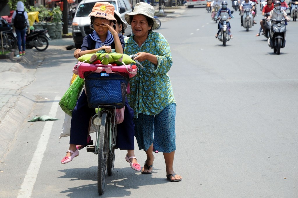 | Bà Nguyễn Thị Mai (40 tuổi, ngụ quận Bình Thạnh) đang chở con gái về từ trường học ở quận 3 vào giữa trưa. Em bé tỏ ra mệt mỏi vì nắng nóng. |