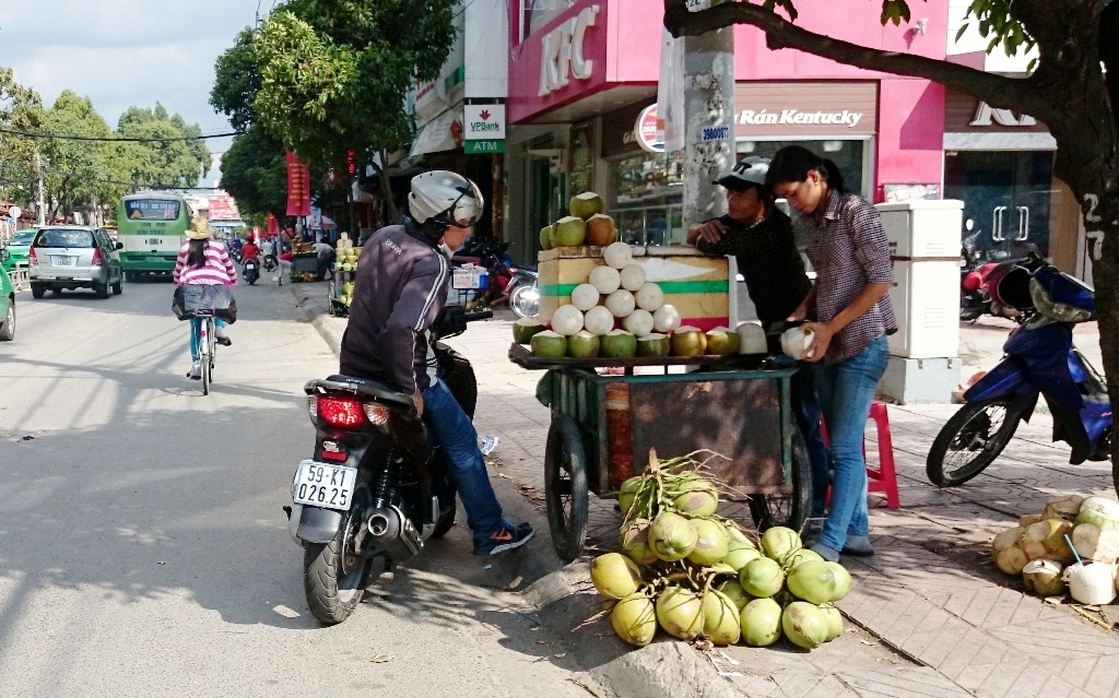 | Trong thời tiết nắng nóng, các loại thức uống giải khát như nước ngọt, đặc biệt là dừa tươi được người dân ưa chuộng. Theo chị Hoa, người bán dừa tươi dọc đường Khánh Hội, lượng dừa bán ra trong những ngày nắng nóng tăng hơn 50% so với ngày thường. |