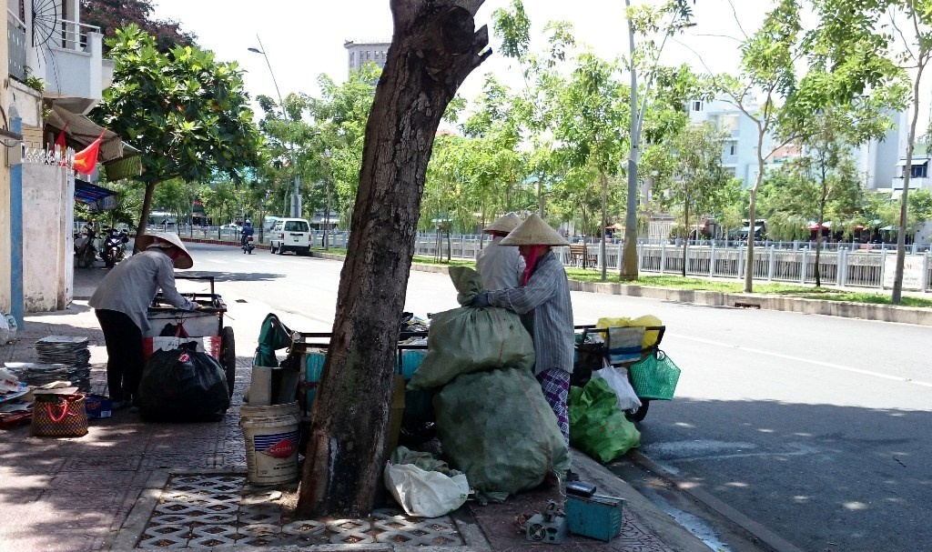 | Những người mua ve chai chọn bóng cây xanh bên kênh Nhiêu Lộc - Thị Nghè làm nơi dừng chân. Chị Trần Thị Thu (42 tuổi, quê Quảng Ngãi) cho biết, buổi trưa chị và các bạn thường nghỉ ngơi, ăn uống và sau đó phân loại ve chai trước khi đem bán tại các vựa tại đây. |