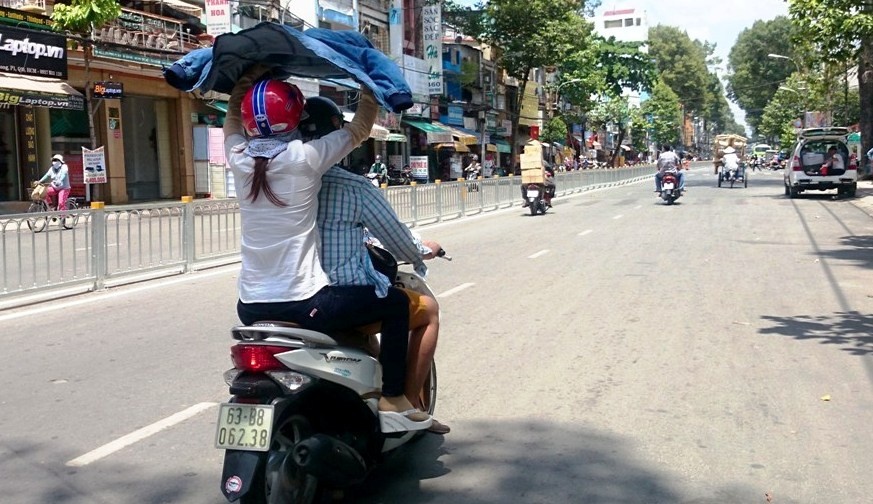 | Để tránh cái nắng gay gắt, hai người dùng áo khoác che đầu khi lưu thông trên đường Lê Hồng Phong, quận 10, TP HCM. |