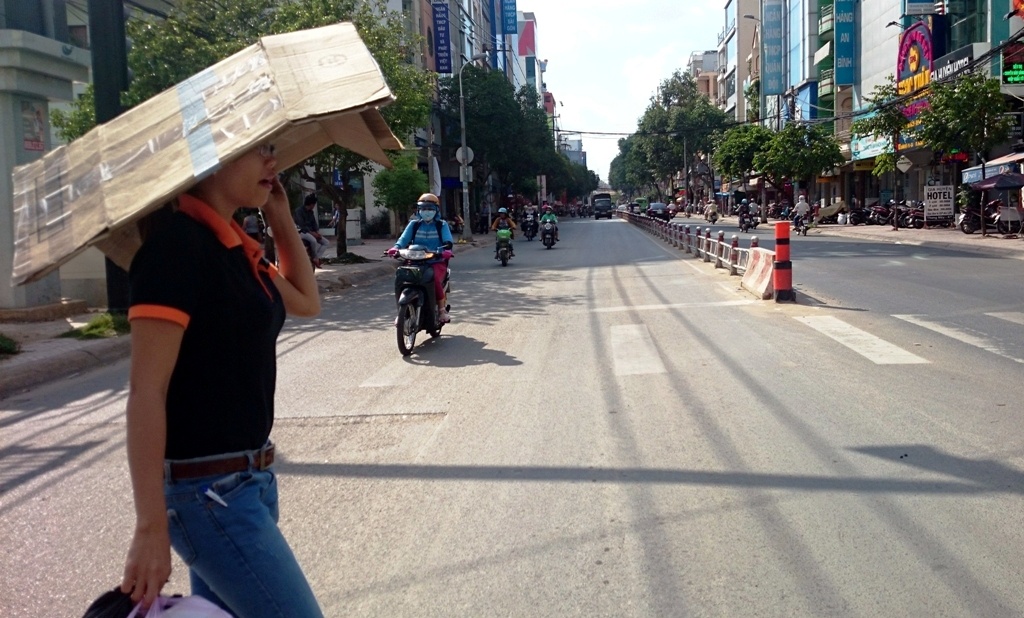 | Một nữ nhân viên công ty điện máy tại quận 4 dùng bìa giấy thùng carton che nắng khi đi mua đồ trên đường Khánh Hội. |