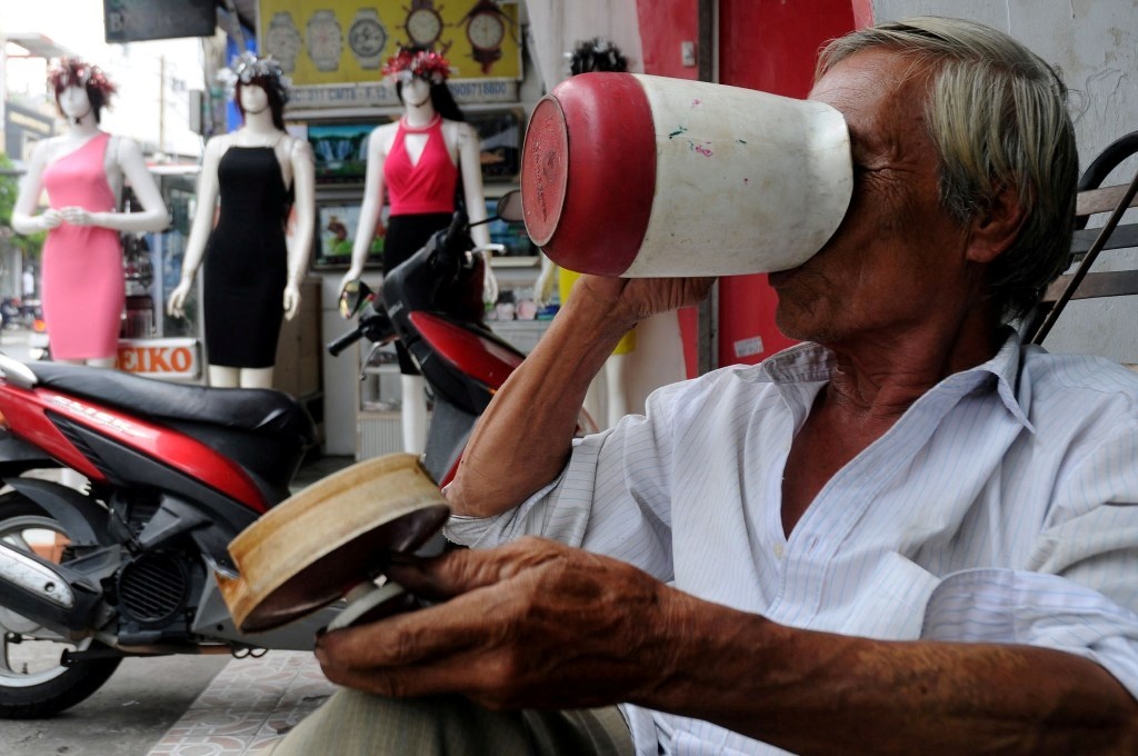 | Ông Ngô Văn Bé (65 tuổi) làm nghề sửa xe trên đường CMT8, quận 3 liên tục uống nước vì quá khát trong ngày nắng nóng. |