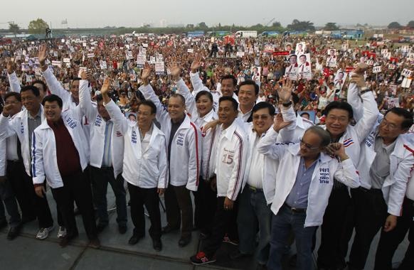 | Các thành viên của đảng cầm quyền Pheu Thai xuất hiện trong cuộc vận động tranh cử đầu tiên ở Bangkok hôm 4/1. Ảnh: Reuters |
