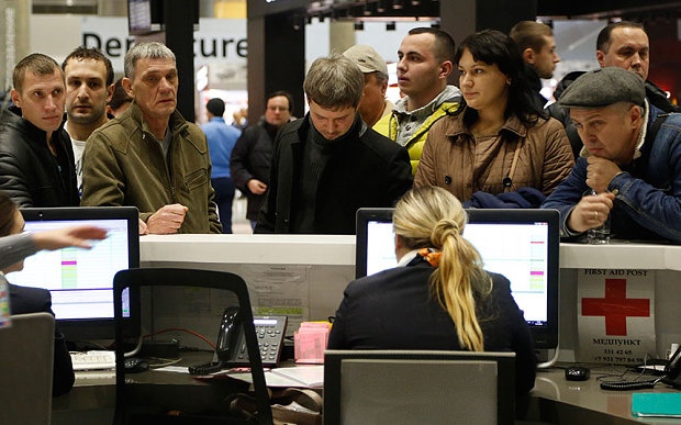 | Người thân của những hành khách trên chuyến bay 9268 tập trung tại sân bay Pulkovo, thành phố St. Petersburg vào chiều 31/10 sau khi hay tin dữ. Máy bay Airbus A321 của hãng Kogalymavia chở 224 người rời một khu nghỉ dưỡng ở Ai Cập trở về Nga đã gặp nạn giữa hành trình. Tất cả hành khách được cho là người Nga. Ảnh: Itar-Tass |