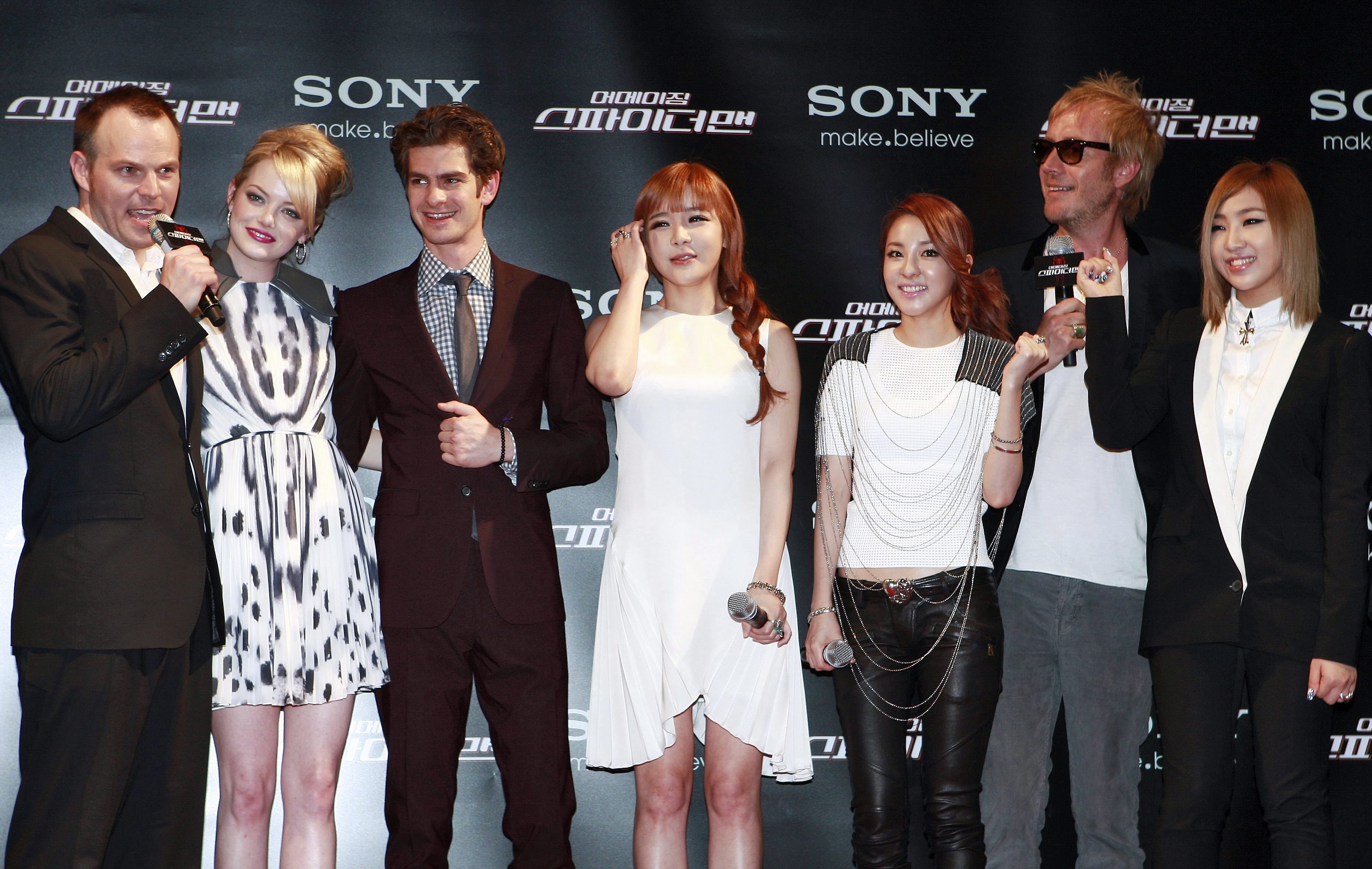 | Emma Stone và 2NE1 tại sự kiện công chiếu Spider Man ở Seoul tháng 6/2012. |