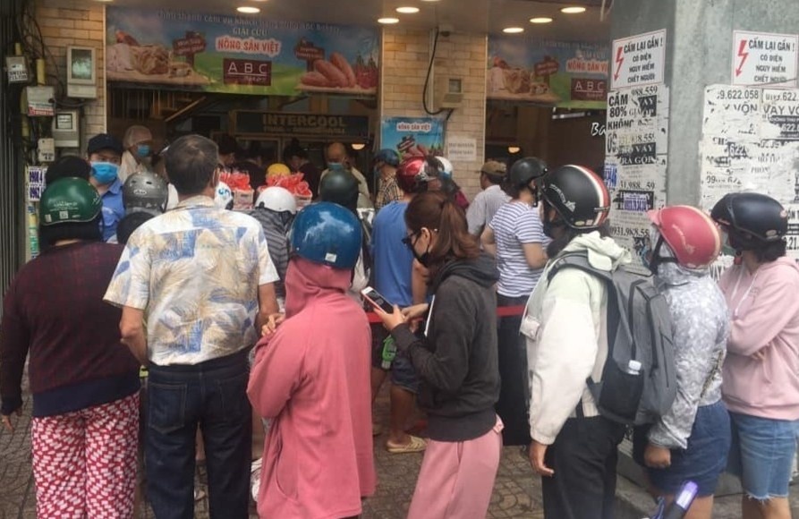 Hồ Phương (quận 10) đợi hơn 15 phút trước một cửa hàng ở quận 5: "Thông tin về bánh mì thanh long mang ý nghĩa giải cứu nông sản khá thú vị, được chia sẻ rộng rãi trên mạng xã hội. Phần vì tò mò hương vị của bánh, phần vì muốn ủng hộ nông dân trong dịch nên mình tìm đến mua cho bằng được". Tuy nhiên, không phải ai cũng mua được bánh, Hồng Khanh cho biết "Mình đợi rất lâu nhưng đến lượt lại hết bánh phải tiếp tục chờ mẻ tiếp theo. Cuối cùng mình đành bỏ cuộc vì bị say nắng". Ảnh: Tran Thi Thanh Tuyen, Thúy Phan. |