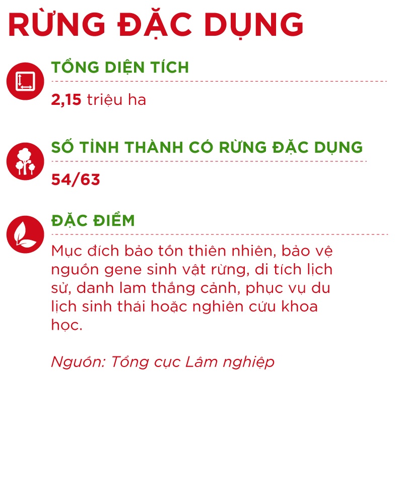 | Rừng đặc dụng được chia thành 3 loại: Khu bảo tồn thiên nhiên (giữ nguồn gen động vật và thực vật): Có thể mở cửa phục vụ nghiên cứu khoa học, không khuyến khích phục vụ du lịch và các nhu cầu văn hoá khác. Vườn quốc gia: Có giá trị bảo vệ thiên nhiên, nghiên cứu khoa học, bảo tồn di tích văn hóa, phục vụ tham quan, du lịch. Rừng văn hóa - lịch sử - môi trường: Sở hữu di tích lịch sử văn hóa và thắng cảnh được xếp hạng, có giá trị thẩm mỹ hoặc bảo vệ môi trường, phục vụ tham quan, du lịch, giải trí, nghỉ ngơi, nghiên cứu khoa học. |