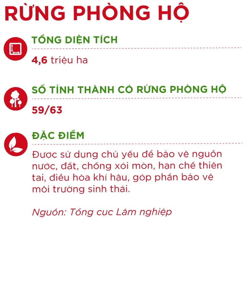 Theo Bộ Nông nghiệp và Phát triển Nông thôn, tại Việt Nam, rừng đặc dụng và phòng hộ phân bố đều các tỉnh, thành phố với 54/63 tỉnh thành có khu rừng đặc dụng, và 59/63 tỉnh có rừng phòng hộ.