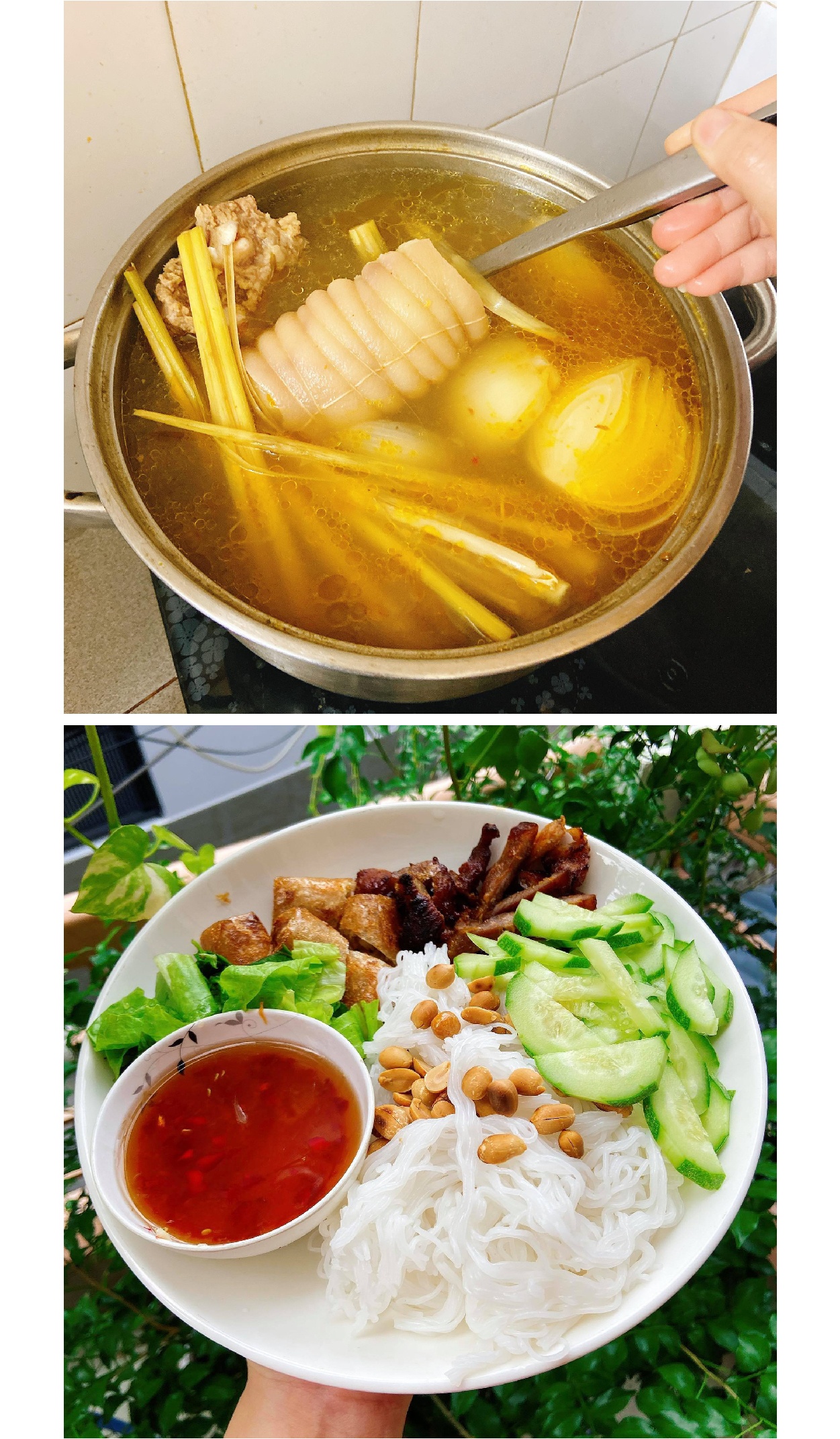 Tuy vậy, khi cả TP.HCM thực hiện Chỉ thị 16, hàng quán không bán mang về, tôi bắt đầu nhớ và thèm đủ thứ, nhất là bún bò. Công thức món ăn có đầy đủ trên Internet nhưng mỗi trang chỉ một cách, tôi phải gọi hỏi thêm cách nấu từ mẹ. Chế biến là khâu tốn nhiều thời gian, mất mấy tiếng mới có tô bún chất lượng thưởng thức tại nhà.