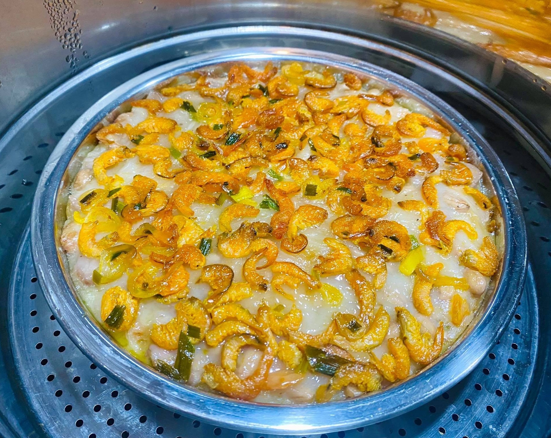 Bước 6: Đổ hỗn hợp ra khay hấp và rải phần tôm khô còn lại lên trên. Hấp trong thời gian khoảng 45 phút là hoàn thành. Chú ý khi hấp không nên để hơi nước ngưng tụ chảy vào bề mặt bánh.