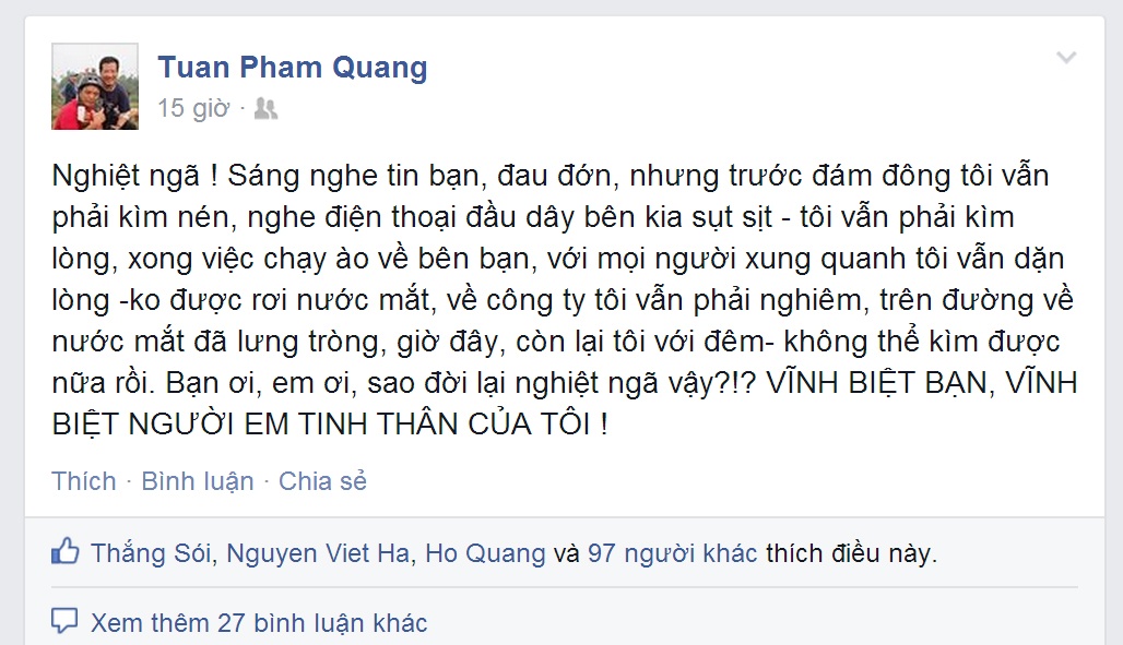 | Trên trang cá nhân Facebook của Đặng Thành Chung hàng trăm bạn bè đã bày tỏ nỗi buồn bằng những dòng đầy tiếc nuối. |