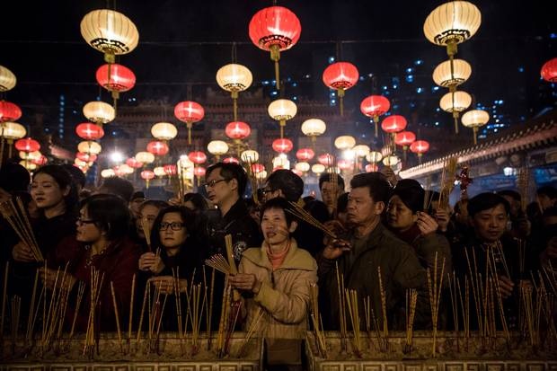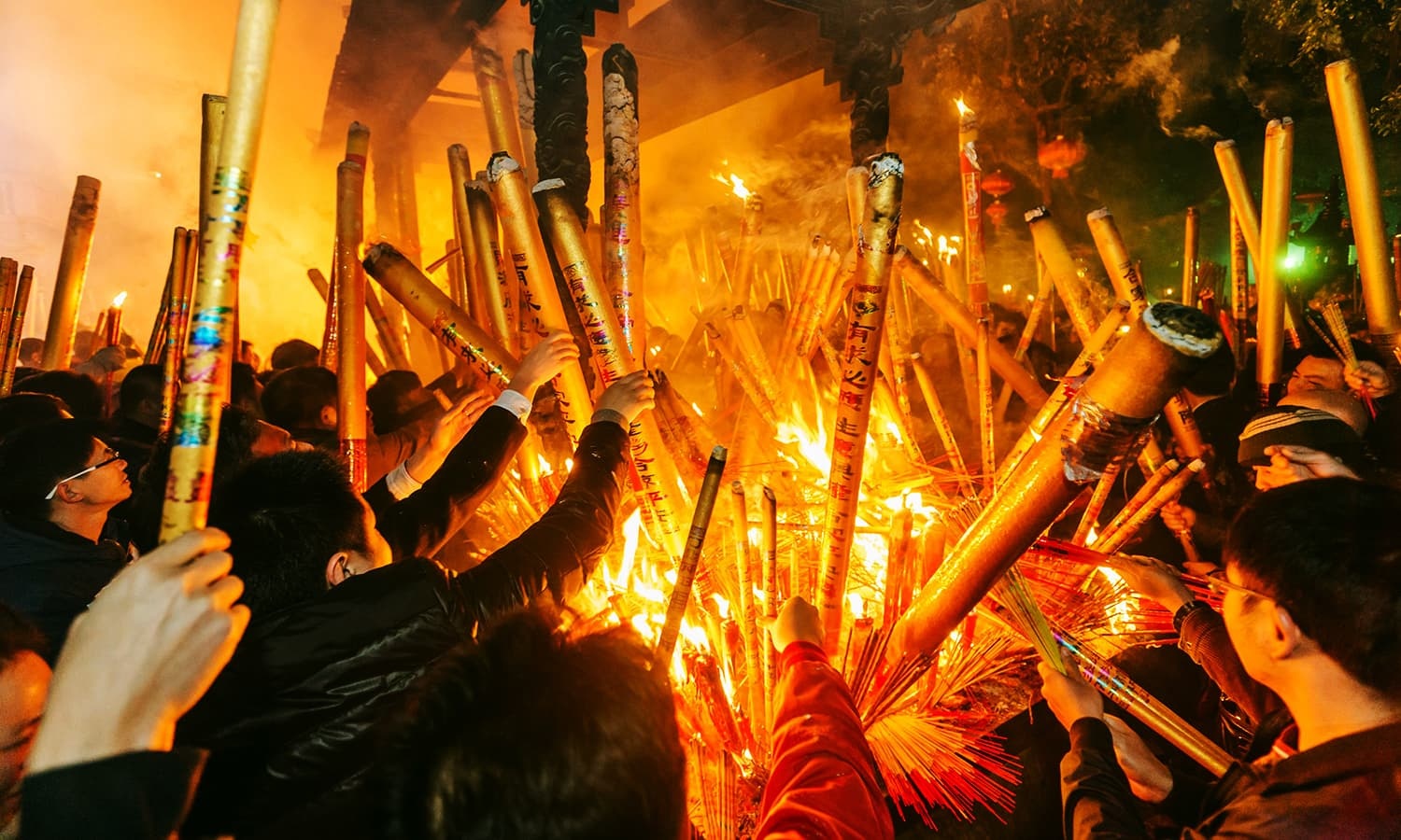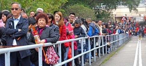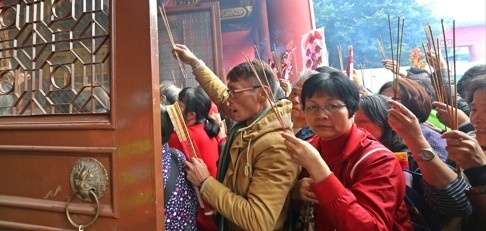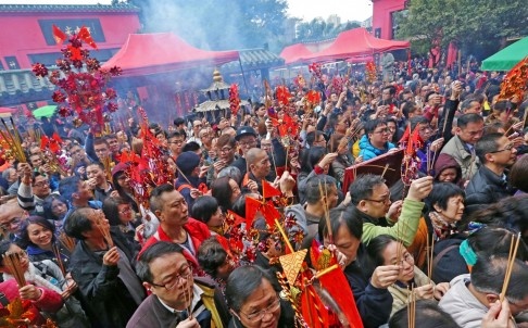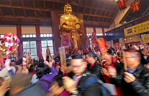 | Hàng trăm nghìn người Hong Kong (Trung Quốc) đổ về ngôi đền Che Kung ở huyện Sa Điền mỗi dịp đầu năm mới. Nhiều người phải chờ đợi rất lâu để đặt lễ và cầu bình an, may mắn. Người Trung Quốc có thói quen đi lễ chùa vào đêm giao thừa và những ngày đầu năm mới. Ảnh: SCMP |