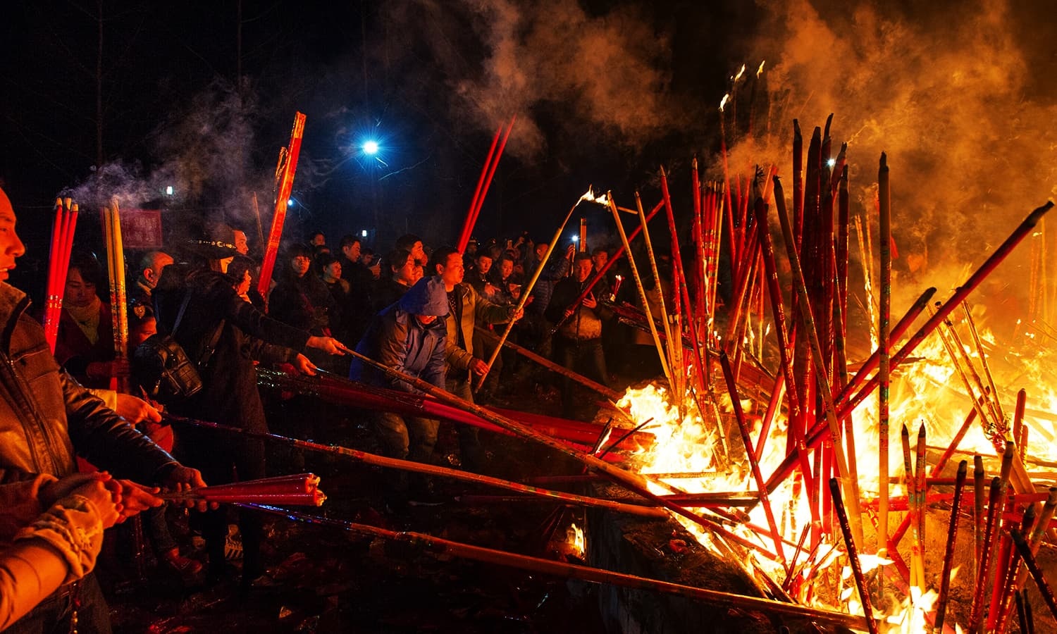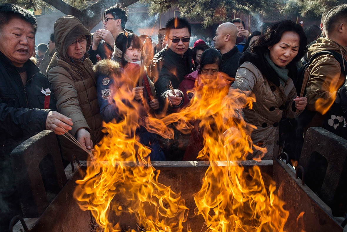 | Lửa và khói mù mịt khi mọi người tranh nhau cắm hương ở chùa Wuyou. Ảnh: Reuters |