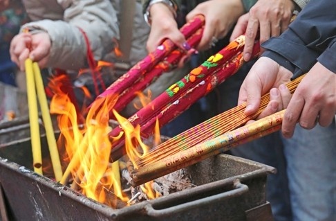 | Những cây hương lớn được châm trước khi người dân vào đền làm lễ. Ảnh: SCMP |