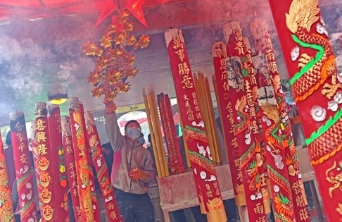 | Người đàn ông dụi mắt vì khói hương dày đặc. Một số người mua đồ cúng ngay tại cổng đền trong khi vài người khác mang theo từ nhà cả bó hương lớn và tờ giấy ghi các bài khấn. Ảnh: SCMP |