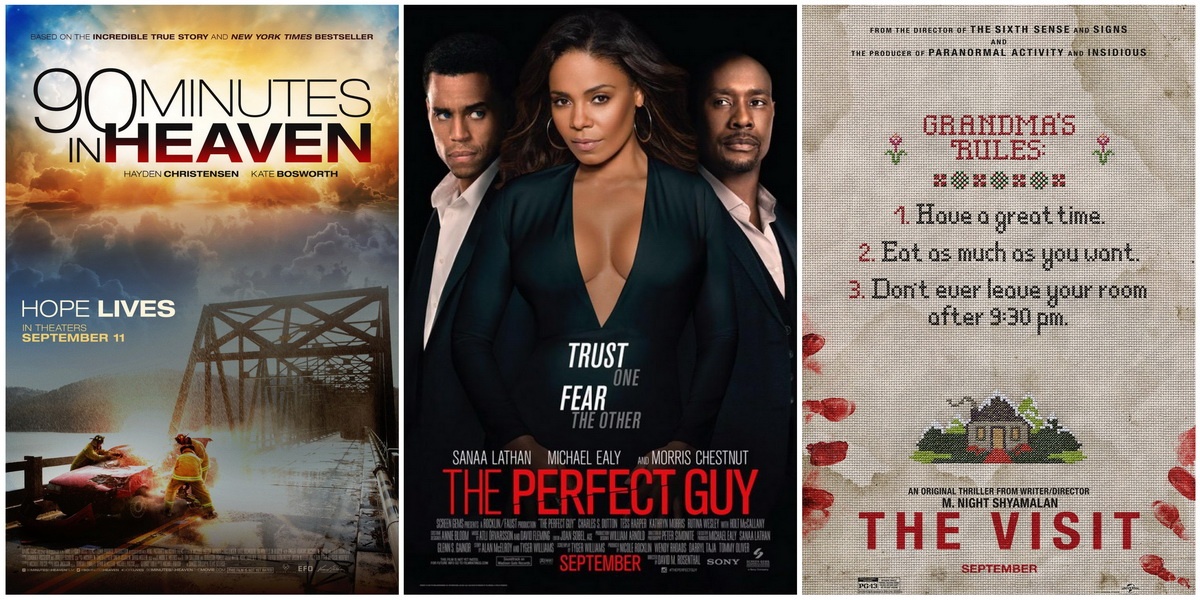 Cuối tuần này, có ba bộ phim mới được khởi chiếu trên diện rộng tại Bắc Mỹ: phim tâm lý 90 Minutes in Heaven, tác phẩm giật gân The Perfect Guy và tác phẩm hài - kinh dị The Visit.