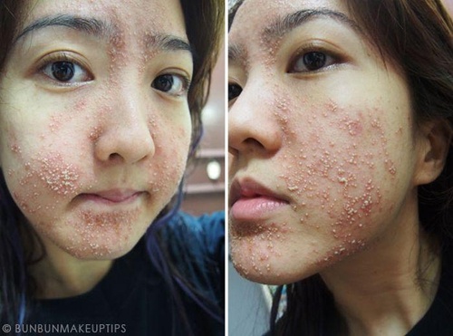 | Một cô gái người Singapore chia sẻ khuôn mặt sần sùi mụn bọc của mình sau khi lột da. |