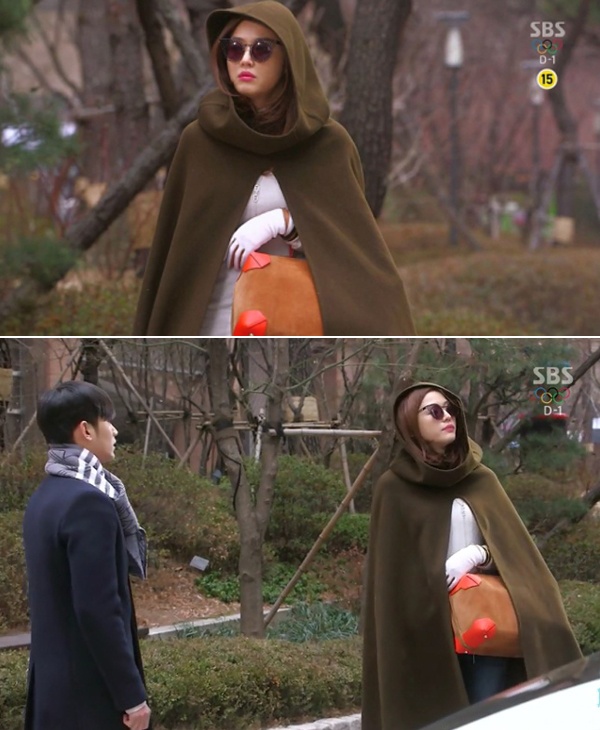 | Trong tập 15, Chun Song Yi khiến khán giả nhớ tới hình ảnh Cô bé quàng khăn đỏ khi diện áo choàng dài dáng cape có mũ với phụ kiện che chắn là mắt kính màu nâu. Chiếc áo choàng có mũ giúp Chun Song Yi không mất nhiều công cải trang mà vẫn kín đáo khi cô đứng ngoài đường đợi xe. |