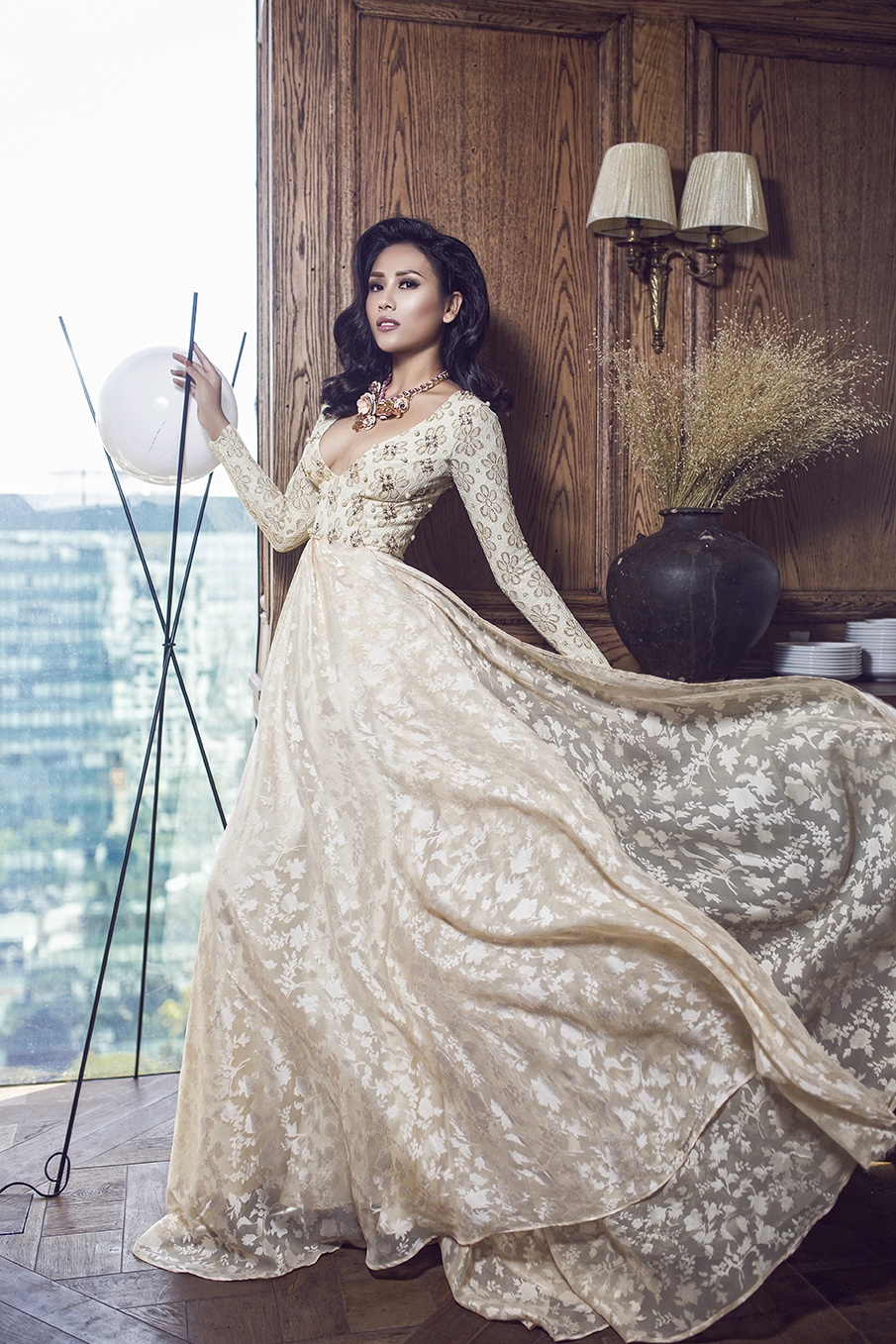 | Gam màu đỏ mang đến ma lực hấp dẫn ánh nhìn. Người đẹp gốc Thái Bình thu hút trong bộ cánh ren đỏ nóng bỏng. Cô tạo dáng kiêu sa trong bối cảnh sang trọng. |