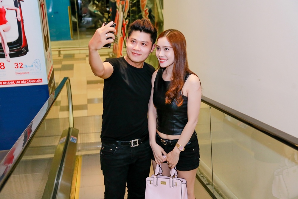 | Nguyễn Văn Chung và bà xã Kim Thanh diện trang phục đồng điệu. Cặp đôi rạng rỡ chụp ảnh bằng điện thoại khi đi thang máy. |